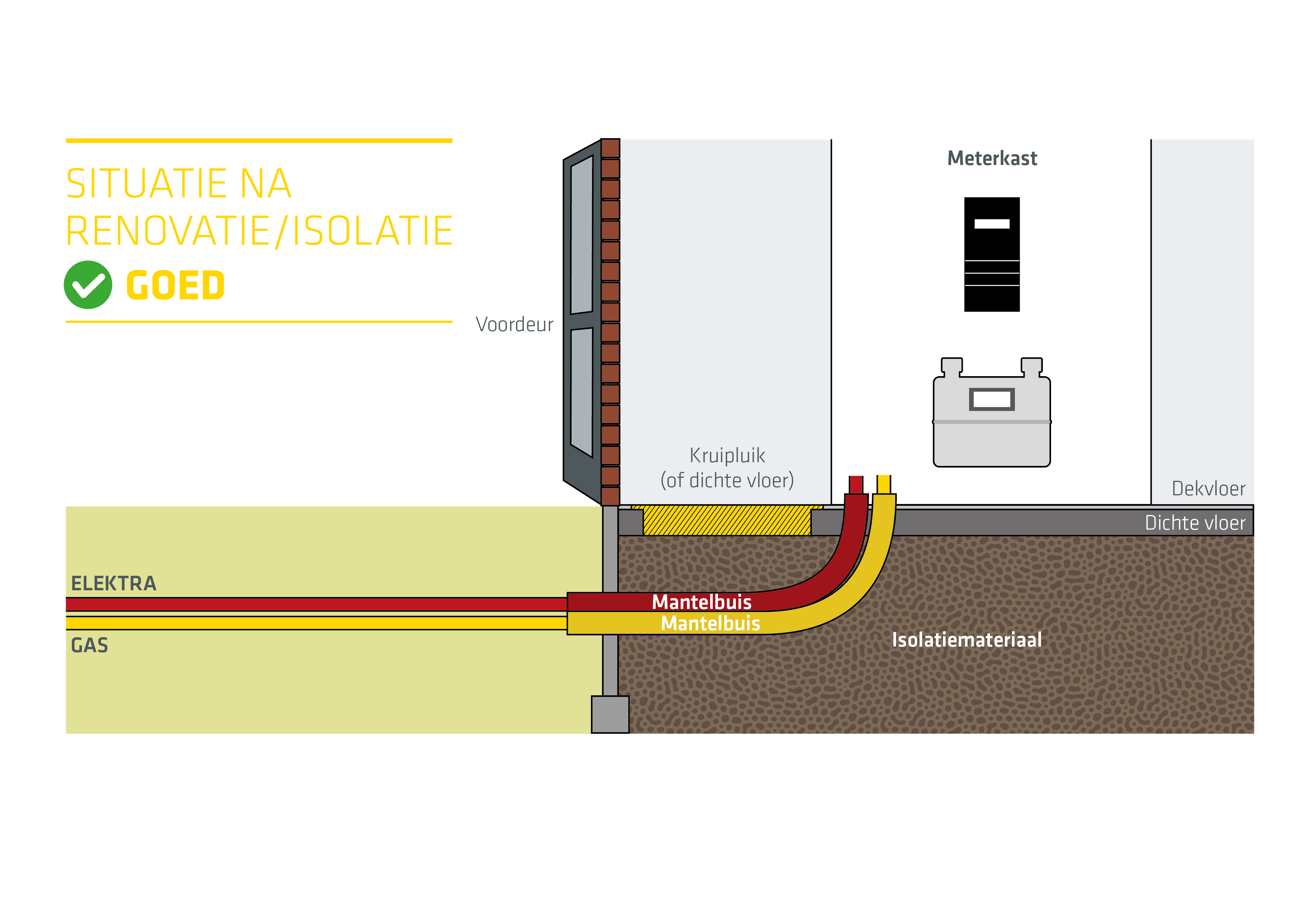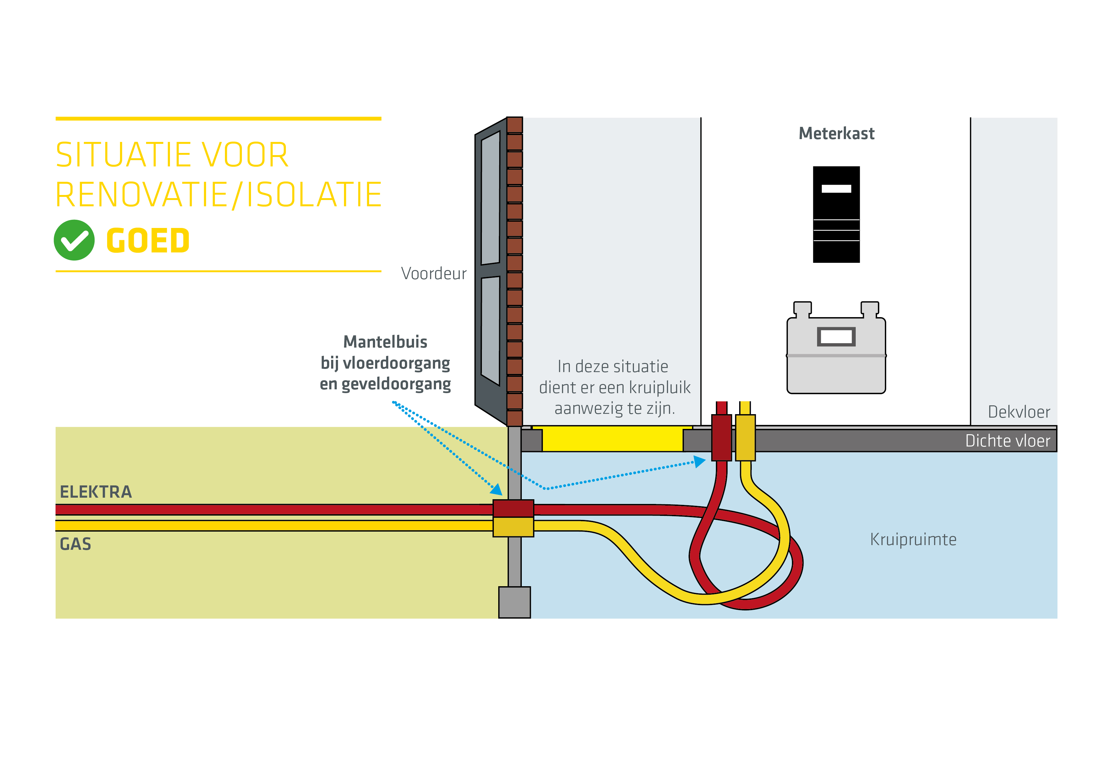 - Voor renovatie/isolatie: er is gedeeltelijk gebruik gemaakt van mantelbuizen ter bescherming van de elektriciteitskabel en gasleiding bij de doorvoer bij de gevel en de meterkastvloer. Voorwaarde hierbij is dat de kruipruimte bereikbaar is door een kruipluik waarmee de elektriciteitskabel en gasleiding bij de aansluiting van het pand bereikbaar zijn.