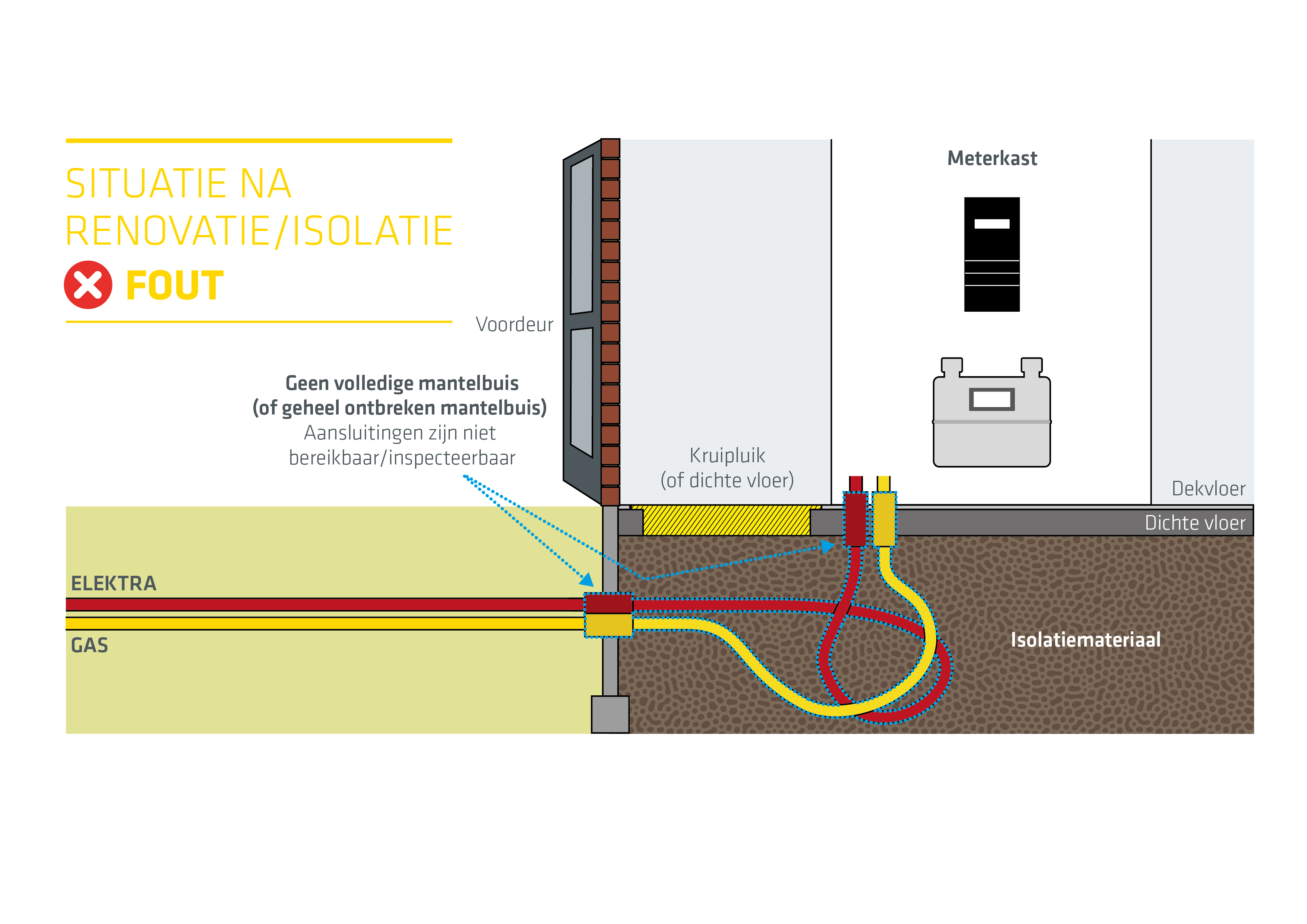 - Na renovatie/isolatie: na renovatie of het aanbrengen van isolatie zijn de elektriciteitskabel en gasleiding bij de aansluiting van het pand niet meer bereikbaar. Ze zijn niet voorzien van mantelbuizen uit één stuk die buiten net voor de gevel beginnen en doorlopen tot iets boven de afwerkvloer in de meterkast.