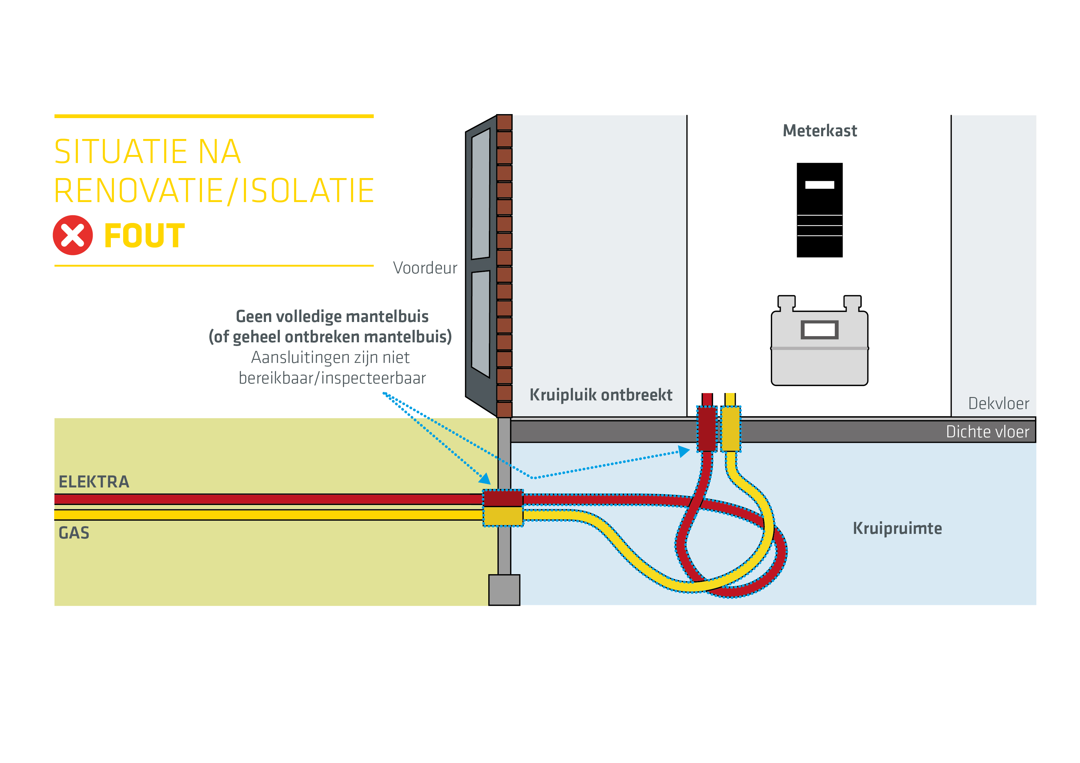 - Na renovatie/isolatie: na renovatie zijn de elektriciteitskabel en gasleiding bij de aansluiting van het pand niet meer bereikbaar omdat de kruipruimte niet meer bereikbaar is. Daarbij zijn de kabel en leiding niet voorzien van een mantelbuizen uit één stuk die buiten net voor de gevel beginnen en doorlopen tot iets boven de afwerkvloer in de meterkast.