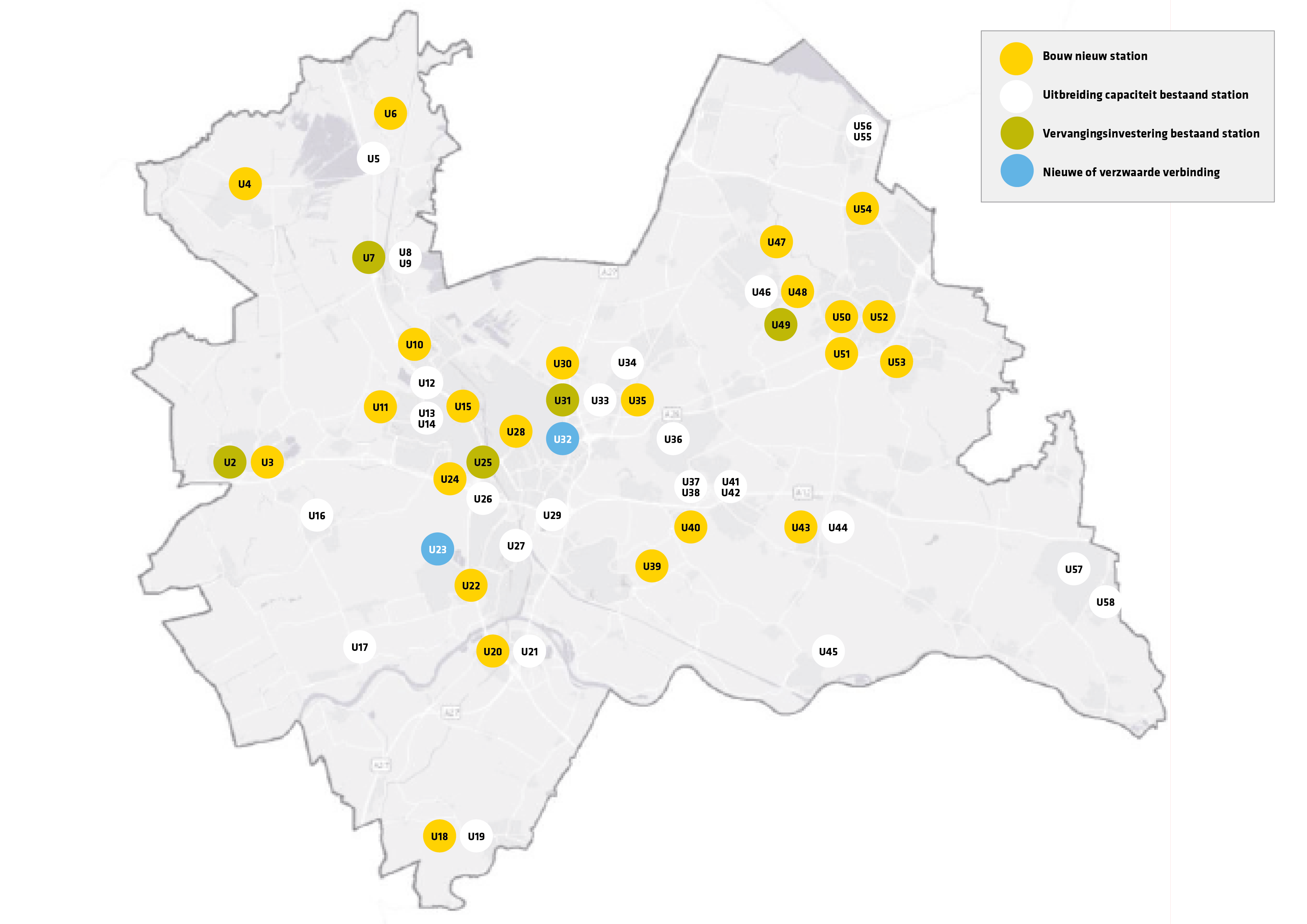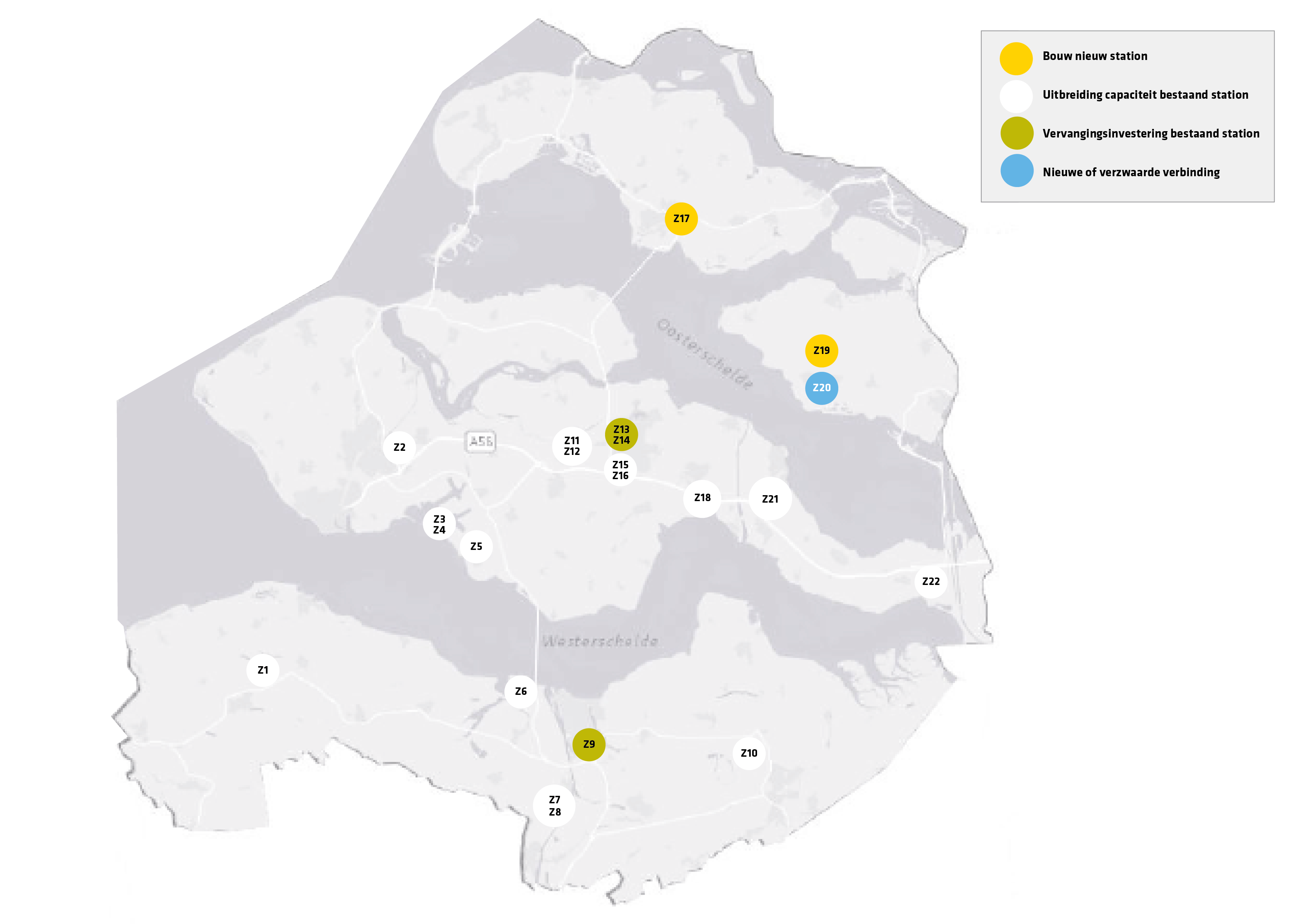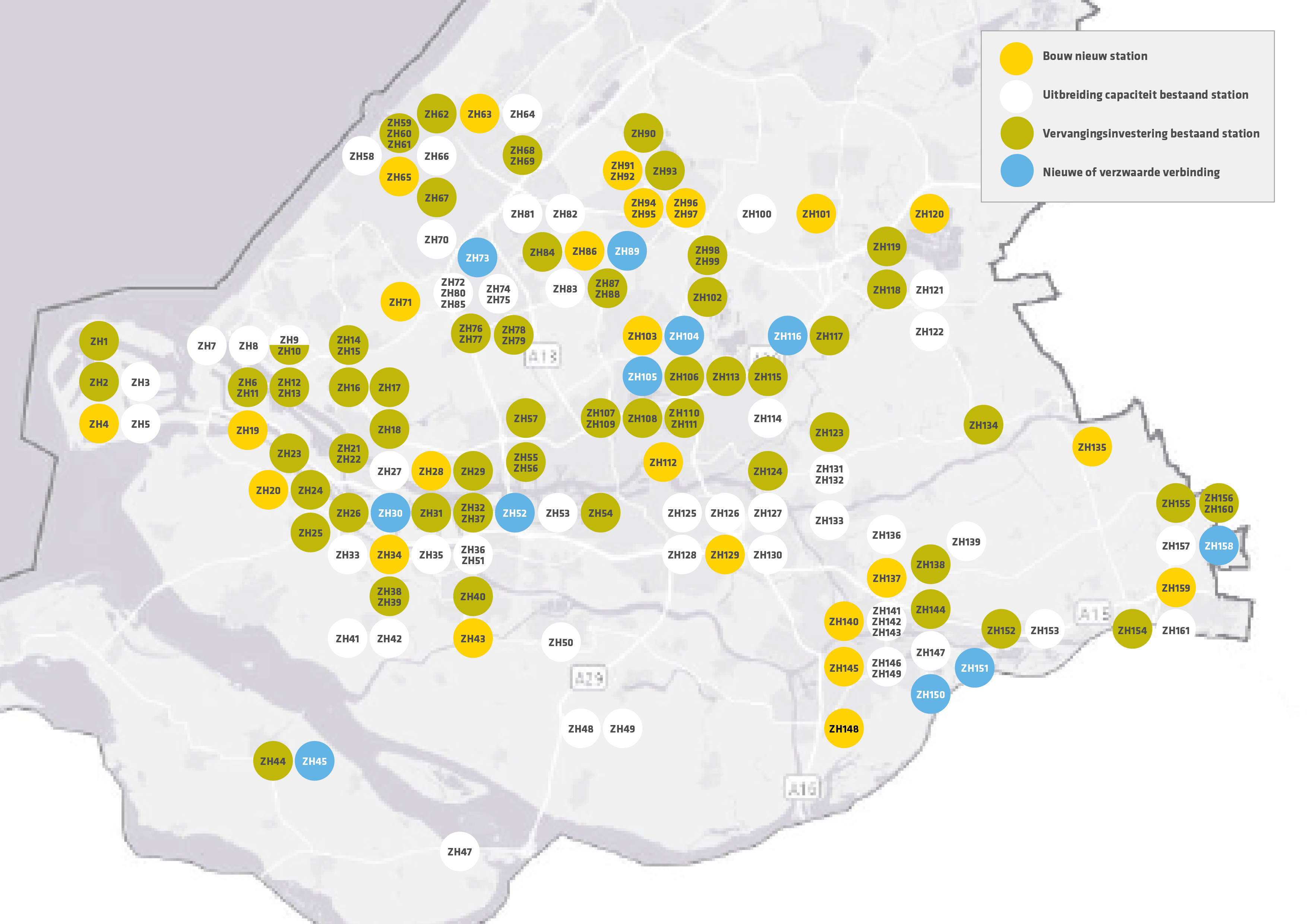Ter ondersteuning van ons investeringsplan ontwikkelden we voor de provincies Utrecht, Zuid-Holland, Zeeland kaarten die de geplande investeringen in een gemeente laten zien. Het gaat hierbij om werkzaamheden aan stations en verbindingen (≥25kV en >8 bar) die in de periode 2024-2033 uitgevoerd worden. Aanvullende informatie over de investeringen staat in het Investeringsplan 2024.