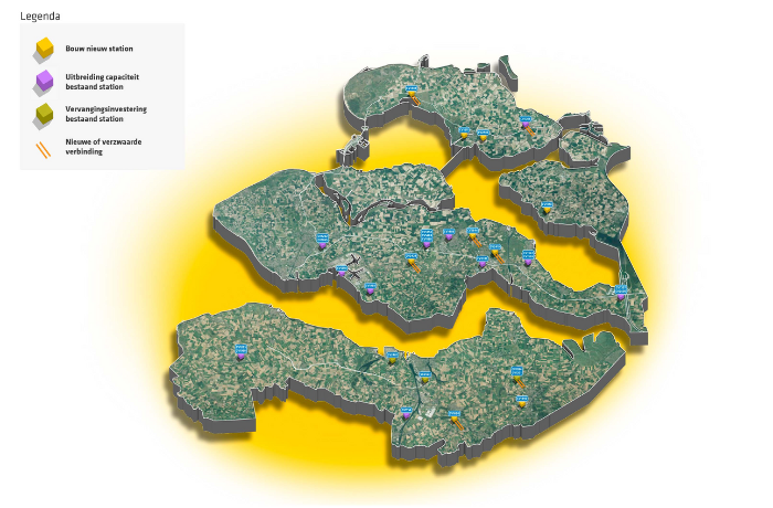 Ter ondersteuning van ons investeringsplan ontwikkelden we voor de provincies Utrecht, Zuid-Holland en Zeeland kaarten die de geplande investeringen in een gemeente laten zien. Het gaat hierbij om werkzaamheden aan stations en verbindingen (≥25kVen >8 bar) die in de periode 2026-2035 uitgevoerd worden. Aanvullende informatie over de investeringen staat in het Investeringsplan 2026.