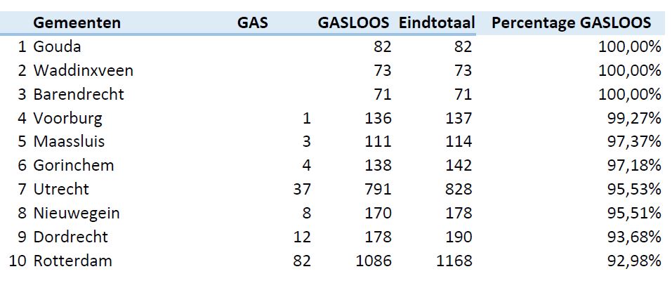 | Gas | Gasloos | Eindtotaal | Percentage aardgasvrij | ||||