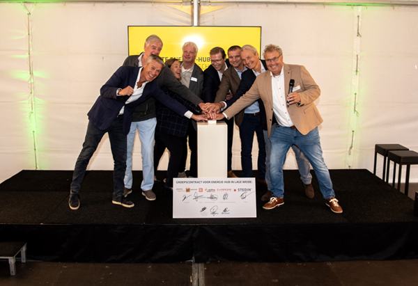 foto: ondernemers binnen energiehub EMCU, netbeheerder Stedin en energiepartner Groendus zetten met groepscontract belangrijke volgende stap voor meer ruimte op het lokale elektriciteitsnet