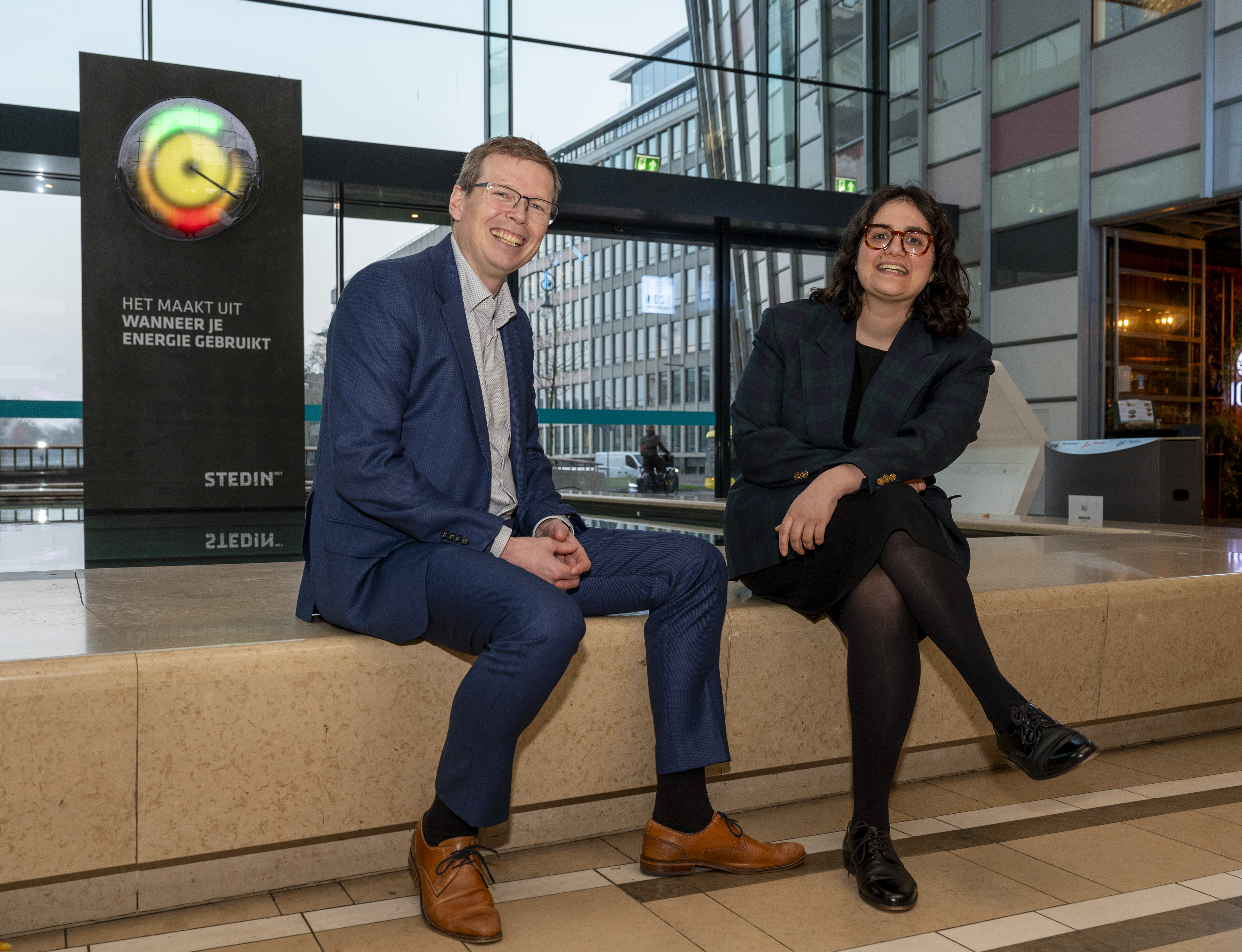 Foto: Warmold ten Zijthoff, regiodirecteur Utrecht bij Stedin, en wethouder Senna Maatoug bij de fysieke eKlok in Hoog Catharijne