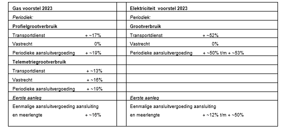 Voor grootverbruikklanten is niet alleen de grootte van de aansluiting maar ook de hoeveelheid gebruik van invloed op de netbeheertarieven. Daarom staan in onderstaande tabel alleen de percentage van de te verwachten verhogingen.