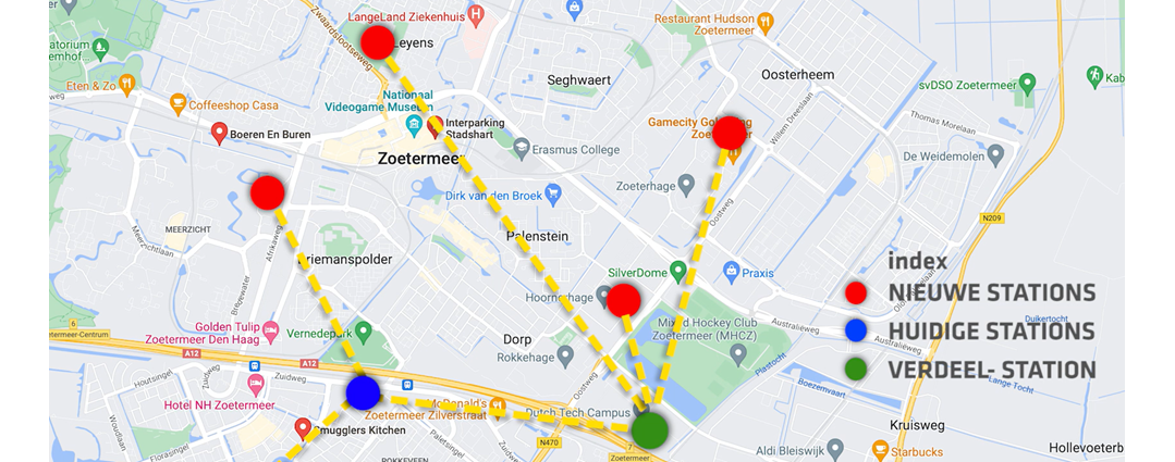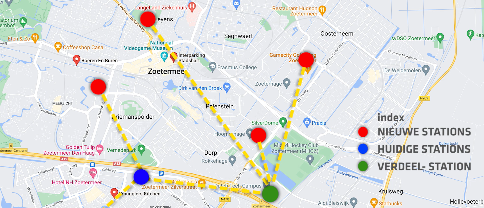 Het hart van het plan ligt bij het centrale verdeelstation aan de Werner von Siemensstraat, rechtsonder op de kaart. Vanaf deze locatie voedt Stedin de toekomstige stations (van rechts naar links) aan de Edisonstraat, Wiltonstraat, Zwaardslootseweg, het Abdissenbos en een vijfde station waarvoor nog een locatie moet worden gezocht. Voor het nieuwe station aan het Abdissenbos gaat nu de eerste paal de grond in. De aanleg van het bijbehorende kabeltracé start ook deze maand. Dit tracé start aan de Groeneweg en loopt dan via het Vernèdesportpark langs de Van Stolberglaan en de Dunantstraat, en steekt bij de Van Leeuwenhoeklaan over richting de Abdissenbos. “Gemeente Zoetermeer is blij dat we gaan starten na jarenlange voorbereiding,” zegt wethouder Marijke van der Meer van Zoetermeer.