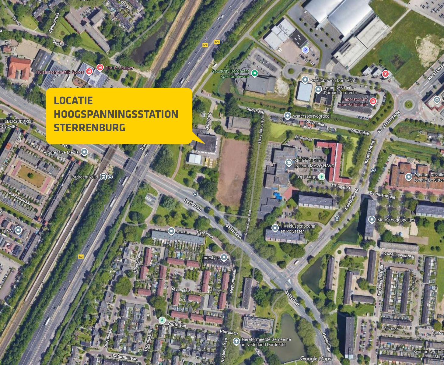 In samenwerking met de gemeente Dordrecht hebben we gezocht naar een geschikte locatie voor de uitbreiding en vervanging van het hoogspanningsstation Sterrenburg. Er is voor gekozen om het bestaande terrein uit te breiden met het naastgelegen stuk grond aan het Steve-Biko pad. Hieronder is een afbeelding met de toekomstige locatie te zien.